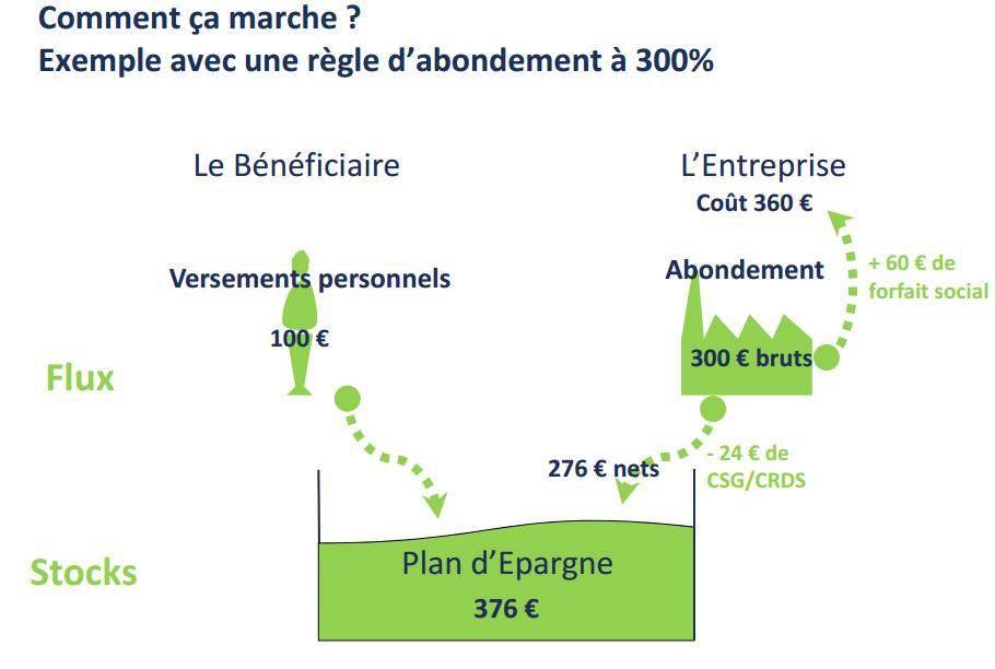 En parallèle, l’employeur effectue un abondement sur le versement des salariés, dans la limite de 300 % du versement du salarié et limité à :